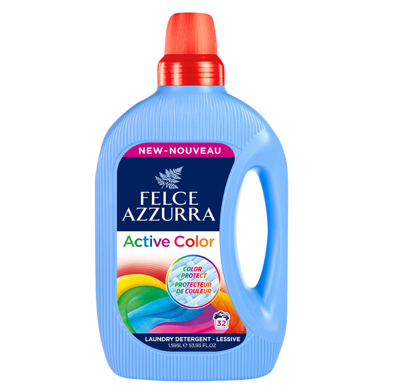2. Felce Azzurra Active Colour – Uniwersalny detergent w płynie, dedykowany kolorowym tkaninom. Skutecznie usuwa plamy, zachowując intensywność kolorów na dłużej.